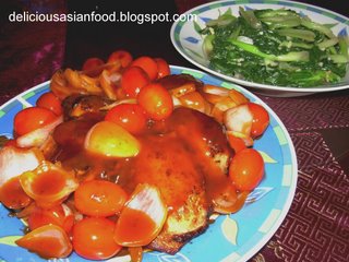 This dish takes me 1 hour to prepare and cook. I am still an amateur and take a longer time to prepare the ingredients and cook them. Briefly, what I have prepared is pan-fried chicken breast, blanched siew pak choy and pasta sauce. Each can be a dish by itself but this is sort of a fusion dish using western and eastern ingredients. In fact, this is the first time I cooked this dish and I was quite pleased! (I am usually quite fussy over the quality of food I cook. My wife will attest to that!)