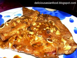 Remove lamb shoulder and set aside. With remaining oil, fry garlic for about 15 seconds and add water, BBQ sauce, Worcestershire sauce, sugar, salt and black pepper powder to taste.