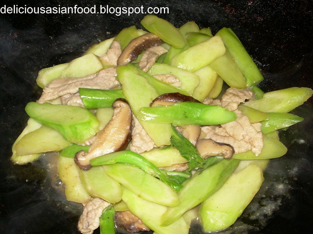 The ideal way to cook this stem is to stir-fry it with medium or large sized prawns which have been deveined and cut “butterfly style”. If you are rich enough, you can consider adding scallops! As I don’t have any prawns at home when I decided to cook this dish and I am not rich enough to consider scallops, I used pork and mushrooms as the supporting cast.