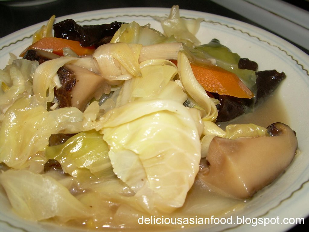 Add carrots, dried lily buds and cabbage and continue stir frying for another 2 minutes. Add a little water (from the water used to soak mushrooms) at a time to ensure that the vegetables do not dry out.
